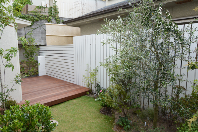 植栽はお子様が遊べるスペースを確保しながら、オリーブをメインに数種類の雑木を植栽。