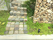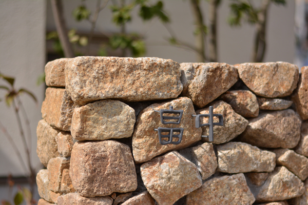 神戸市御影なので、古い町並みには御影石が沢山使われています。そんな雰囲気と馴染んでもらいたいと思い、花崗岩の石の門柱を提案させて頂いたところ、施主様にもご理解いただけました。ハードウッドのフェンス、ベルギーの古ピンコロの階段、オリジナル門扉、標札他。