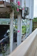 掻き落としとフルレンガの門柱、ウッドフェンス、植栽、鉢植えバラ、オリジナル表札、オリジナルカーブミラー