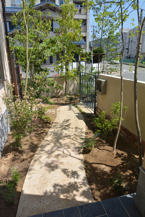 オリジナル鉄製表札 オリジナル鉄製門扉 オリジナル鉄製フェンス アプローチ:土風洗い出し 門柱:イギリス産古レンガと掻き落とし