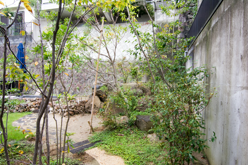 アプローチ・玄関ポーチ:コンクリート。木フェンス横格子。 中庭;栗石の石垣。古レンガの小道。モルタル土色のアプローチ 石と植物の壁。栗石の花壇 高木:コハウチワカエデ・ソヨゴ・ヒトツバタゴ・イジュ アオダモ 低木:ハルイチバンツツジ・コバノズイナ・コデマリ ミツバツツジ 草花;カレックス・ワイルドオーツ・ベニシダ・フッキソウ他